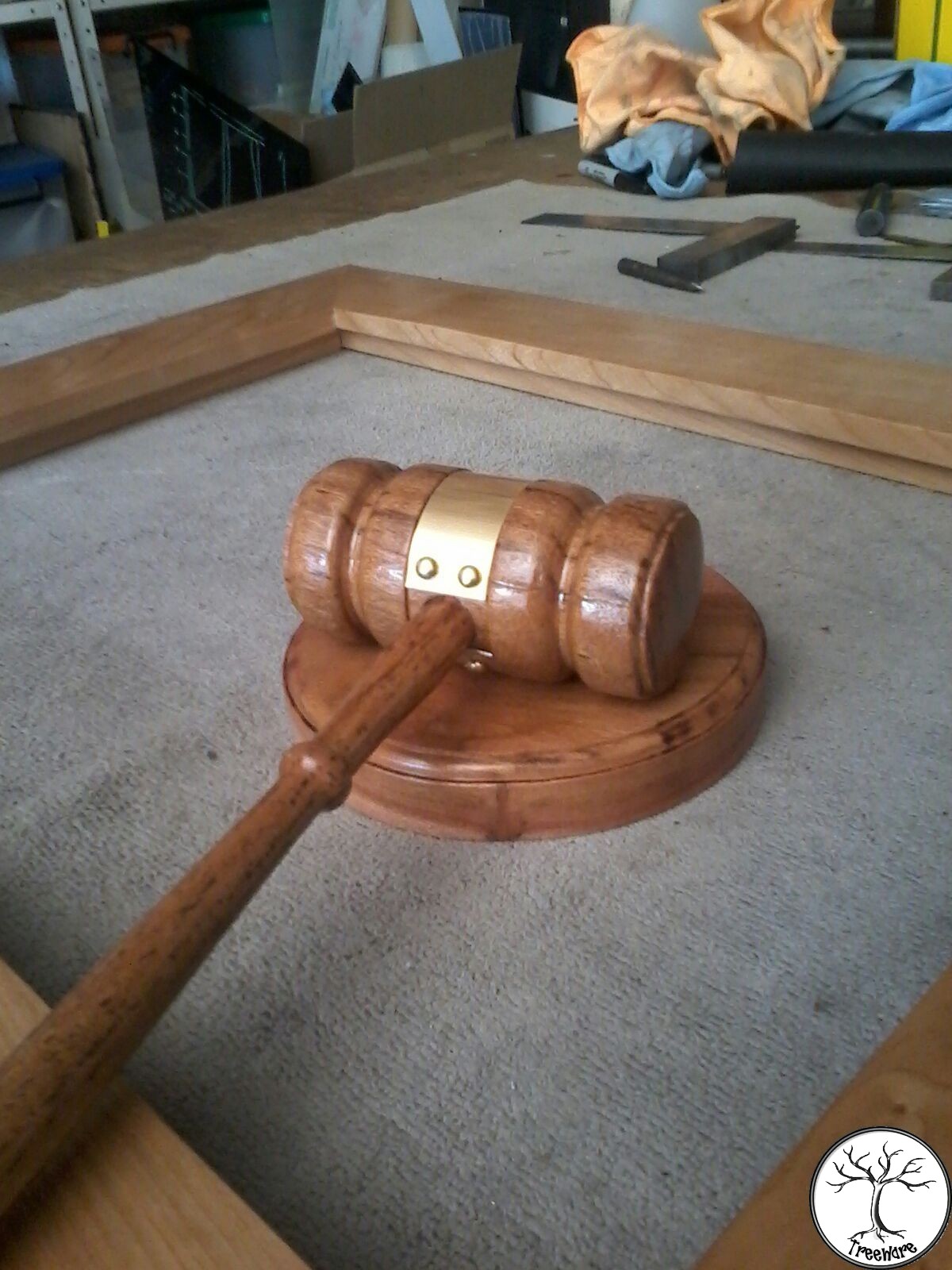 Custom gavel turned from Rhodesian Teak and finished with a brass engraving tag.